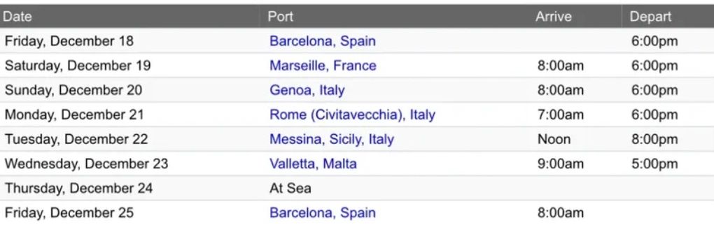Barcelona, Marseille, Genoa, Civitavecchia, Messina, Valletta, Barcelona